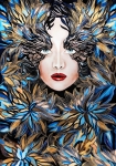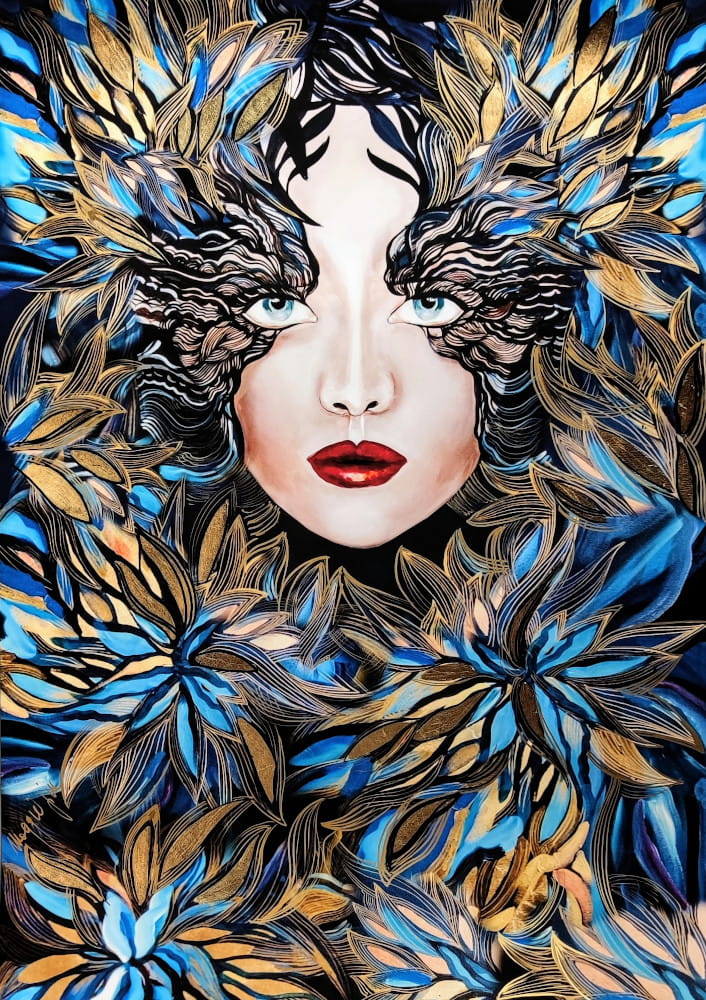 Art-plakat „Goldiva Szafiro III PRO” 70x100 cm to kopia fragmentu obrazu Maggie Piu z cyklu „Goldivy”, barokowej, bogatej zdobniczo, złotej serii inspirowanej między innymi wzorami z dawnych tkanin, w której pojawiają się również rozmaite motywy stale obecne w twórczości Maggie Piu.