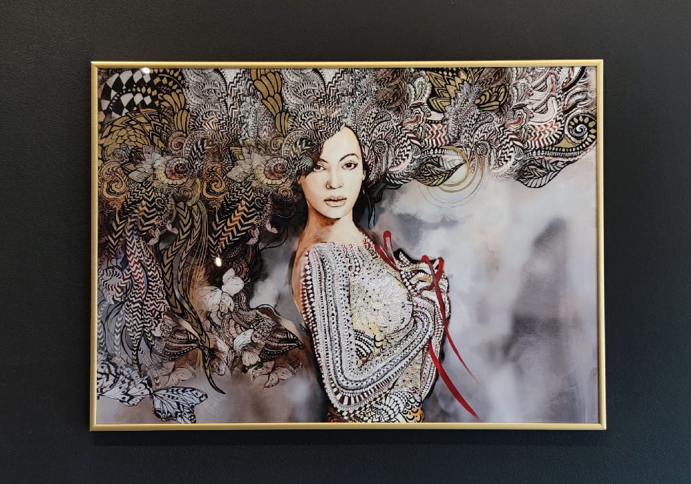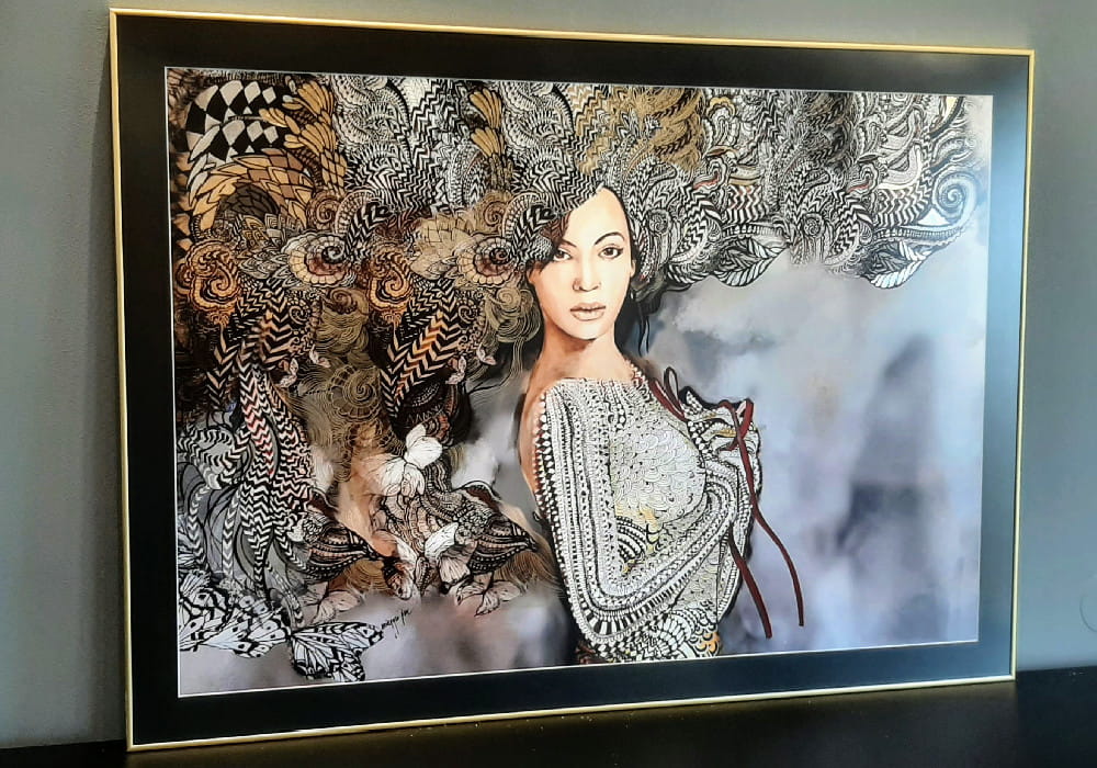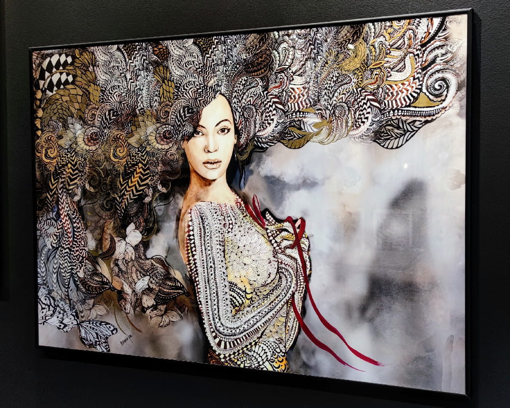 indywidualnie zdobiony, ręcznie wykończony farbami przez Maggie Piu. Bazując na podstawowej wersji plakatu Madame Butterfly Grey -70x50 cm autorka domalowuje złocenia, tworząc efektowny wizualnie ręcznie zdobiony egzemplarz kolekcjonerski. Istnieje możliwość dedykacji oraz zmiany formatu. Zdjęcie z passe-partout poglądowe.
